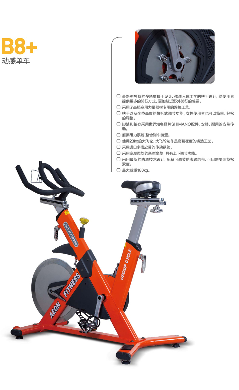 型号:B8+ 毛重" 66 kgs 净重 60 kgs 主架厚度 40 x 118 x 2.5mm 承重量 150 kgs 占地面积 长1350*宽640*高1200(mm) 在结构上,将CB8500采用的“工”字型结构改成“ ”型结构,大大提升了机台的稳固性。 升级了坐垫,将CB8500采用的坐垫,升级更加舒适更加专业的品牌坐垫。 升级脚踏和轴心,脚踏采用更加专业的进口品牌脚踏,轴心在原有的品牌SHIMANO的基础上升级更高等级的轴心。 在颜色方面,将CB8500采用的黑色,升级为更加绚丽的红色。使整个机台看上去更加时尚。